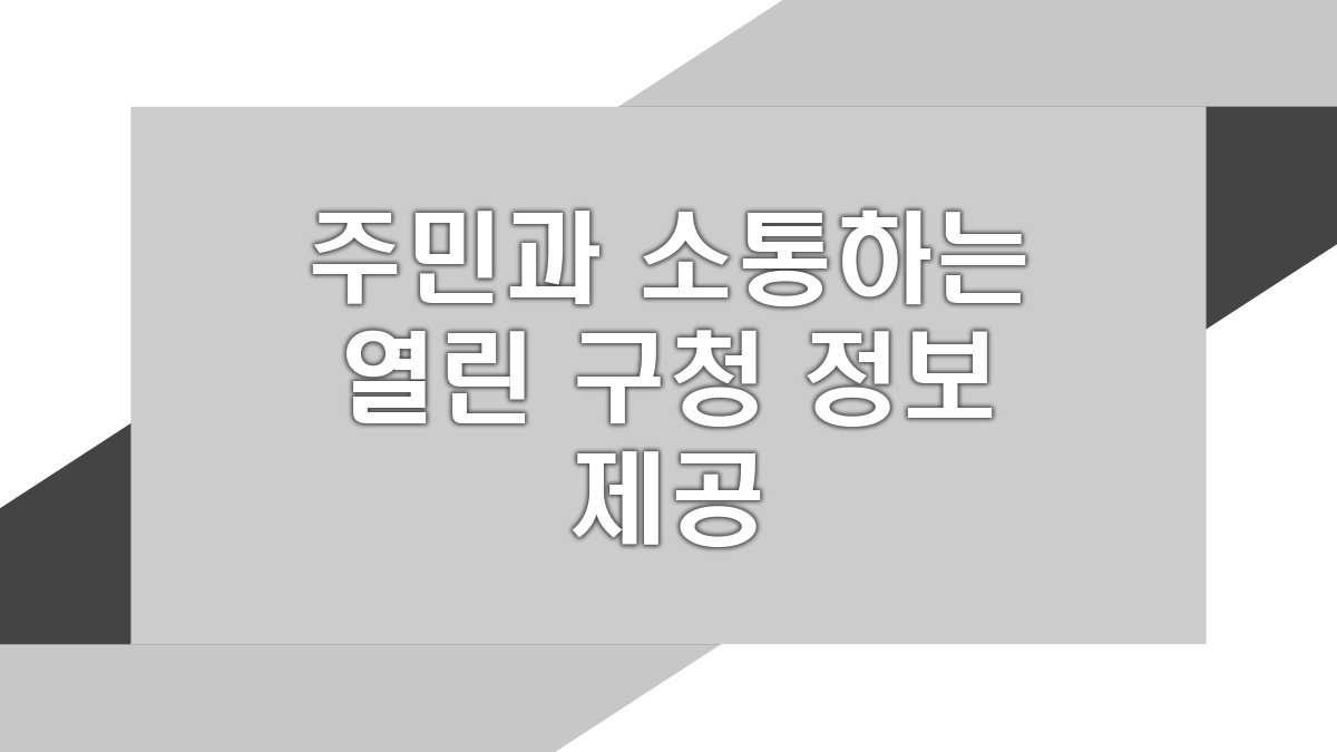 열린 구청은 주민들에게 제공하는 정보의 투명성을 중요하게 생각함. 이를 통해 주민들이 보다 쉽게 구청과 소통할 수 있는 기회를 만들어주고 있음. 또한, 다양한 정보를 제공함으로써 주민들이 필요한 것을 쉽게 찾을 수 있게끔 하여, 생활의 편리함을 더하고 있음. 자연스럽게 주민의 참여를 유도할 수 있는 환경을 조성해 주고 있니 많은 관심이 필요함.